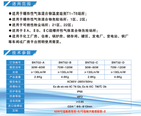 防爆LED灯 百纳品牌 适用于爆炸性混合物场所 30/60/70/120W